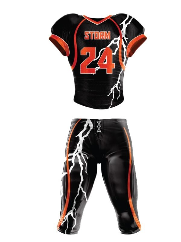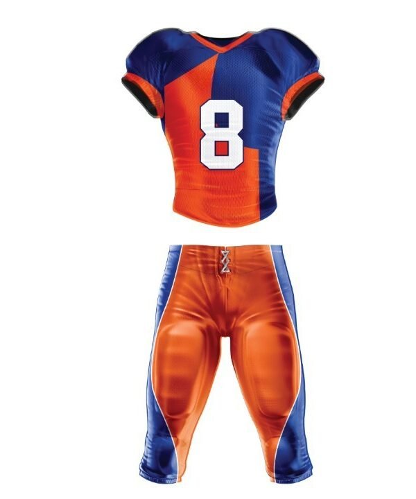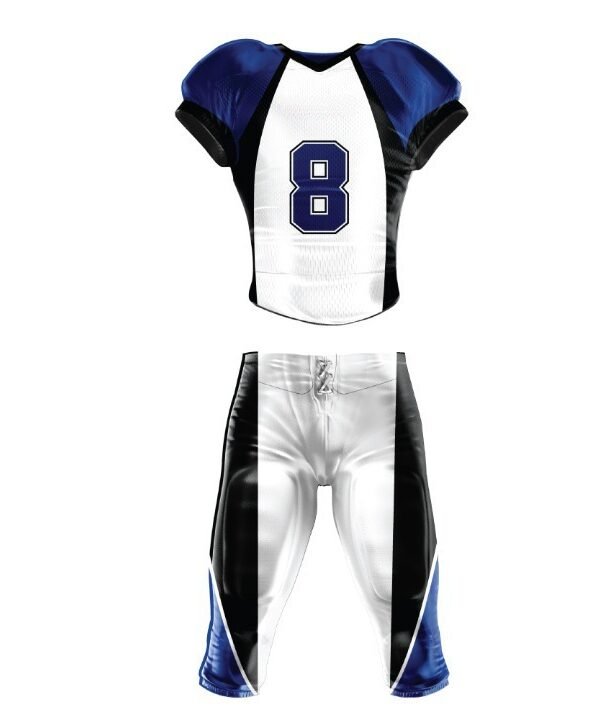 Product Name AMERICAN FOOTBALL UNIFORM Product Specifications Sublimated football uniforms with preset patterns printed on full dye sublimation technology 100% lightweight yet strong and breathable polyester fabrics Self material Neckline and Armholes Twice-reinforced seams Inclusions: Stock Logos, Ghosted Mascots Upgrades available: Your Custom Logo COMPLETELY CUSTOMIZABLE IN DIFFERENT COLORS